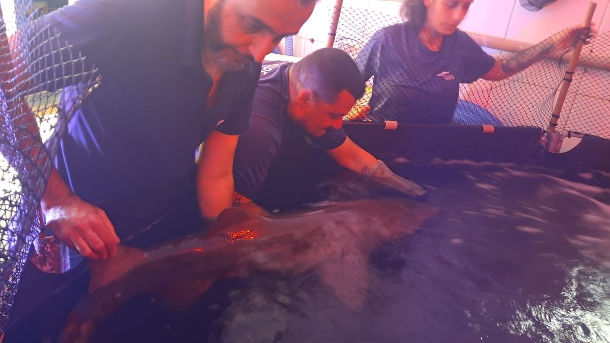 Veterinários e biólogos trabalham com atenção especial, pois as chances de salvar o tubarão são pequenas, sobretudo devido a sinais de baixa oxigenação causados por ferimentos de pesca.